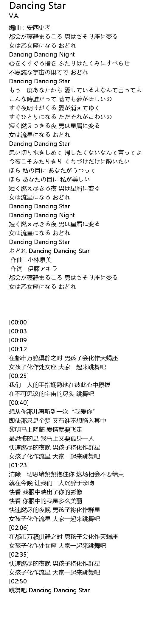 | [02:31.5] | 女孩子化作处女座 大家一起来跳舞吧 |