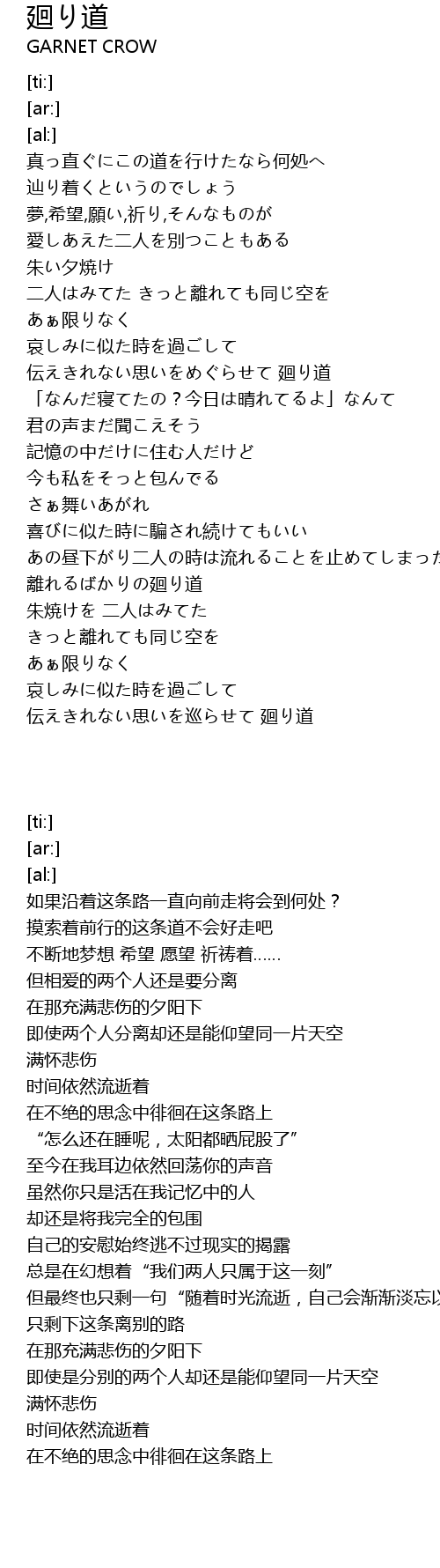 | [01:32.53] | 伝えきれない思いをめぐらせて 廻り道 |
