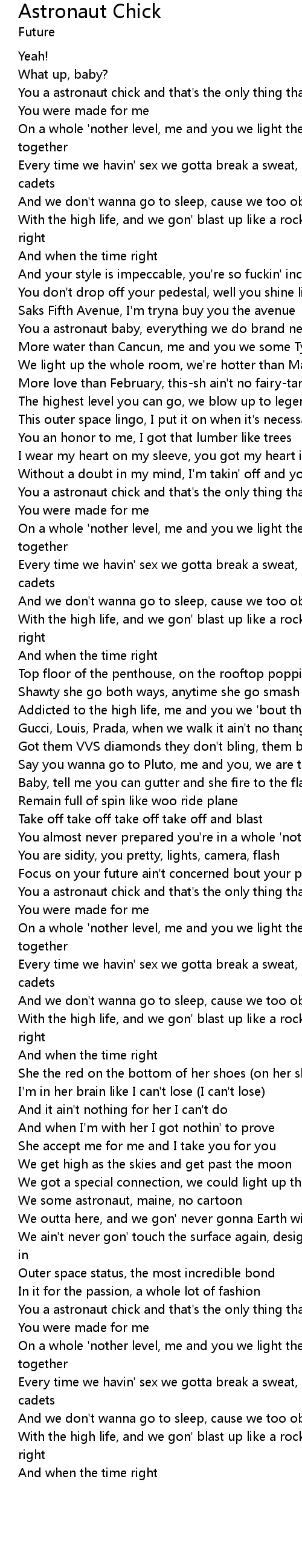 | [01:17.35] | You a astronaut chick and that's the only thing that matter to me |