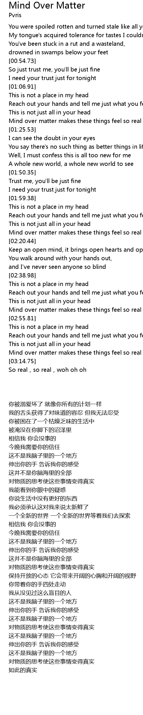| [03:11.33] | Mind over matter makes these things feel so real |