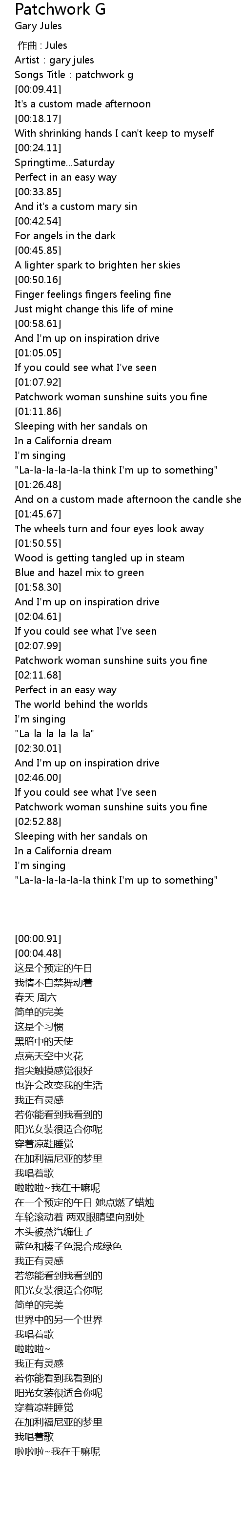 | [02:49.63] | Patchwork woman sunshine suits you fine |