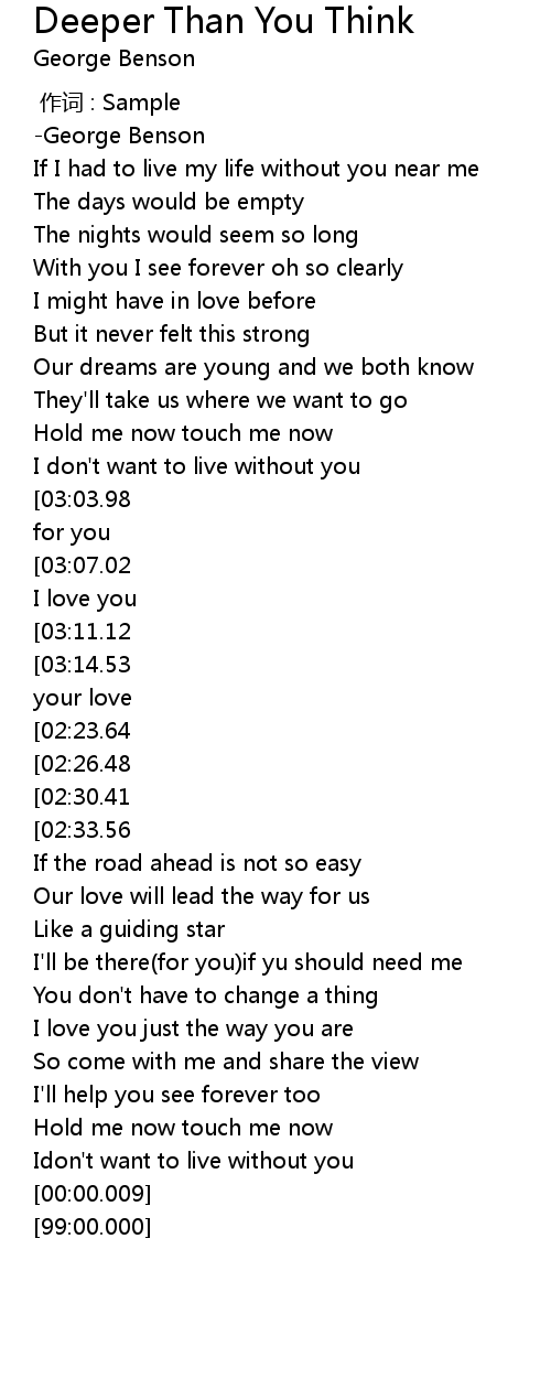 | [03:30.93][03:03.98][02:36.59][02:09.81][00:56.82] | Nothing's gonna change my love for you |