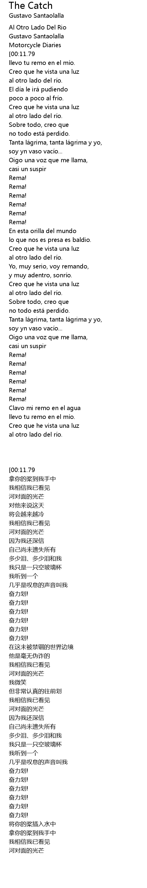 | [00:07.48][00:11.79] | Clavo mi remo en el agua |