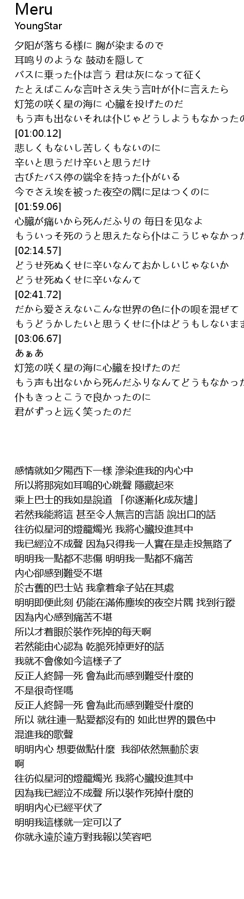 | [03:15.18] | 因為我已經泣不成聲 所以裝作死掉什麼的 明明內心已經平伏了 |