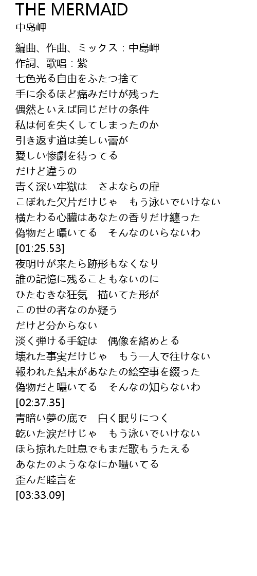 | [00:02.47] | 編曲、作曲、ミックス:中島岬 |