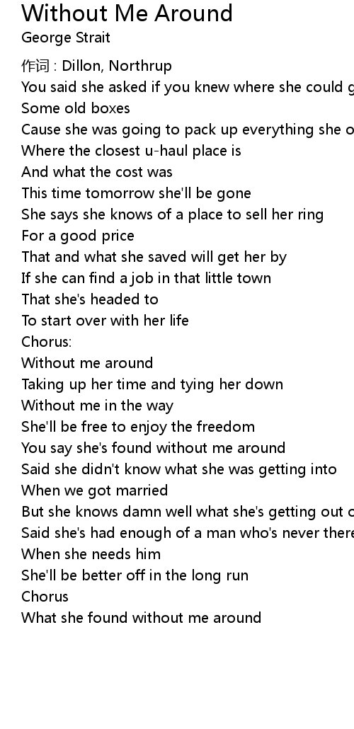 | You say she' s found without me around | |