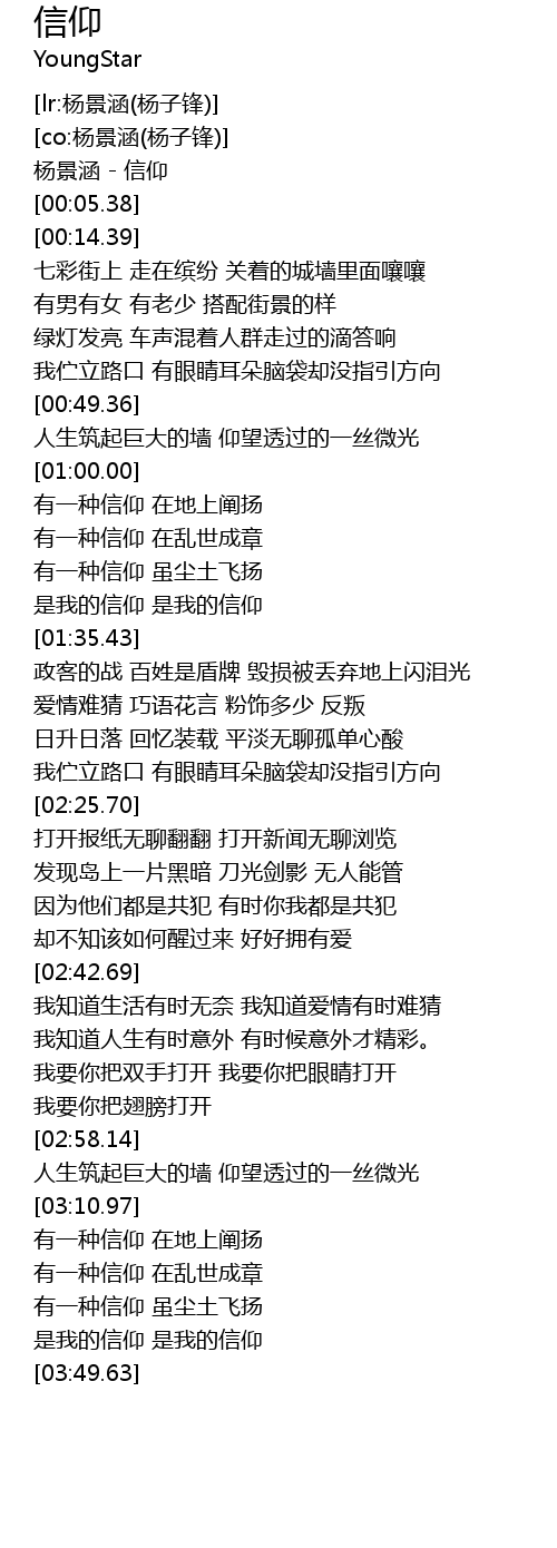 | [00:00.00] | 杨景涵 - 信仰 |