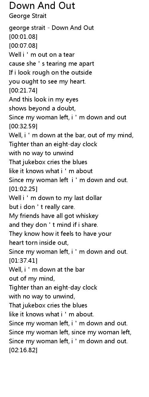 | [01:59.61] | Since my woman left, i'm down and out. |