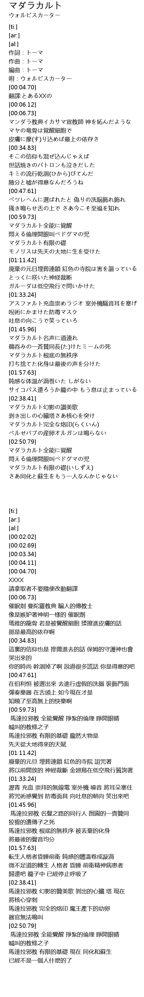 | [02:39.81] | 馬達拉邪教 幻影的贊美歌 剝出的心臟 塔 現在 將核心穿刺 |