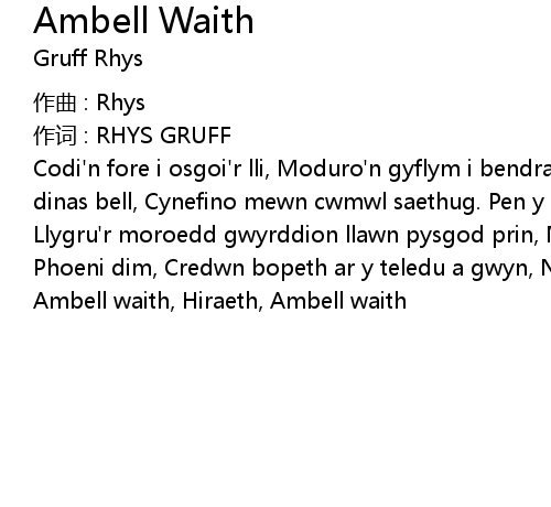 | Codi' n fore i osgoi' r lli, Moduro' n gyflym i bendraw' r byd. Deffro' n fore mewn dinas bell, Cynefino mewn cwmwl saethug. Pen y daith, Hiraeth, Ambell waith. Llygru' r moroedd gwyrddion llawn pysgod prin, Malu' r awyr a | |