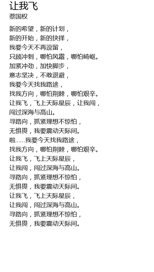 | [01:22.88] | 让我飞,飞上天际星辰,让我闯, |