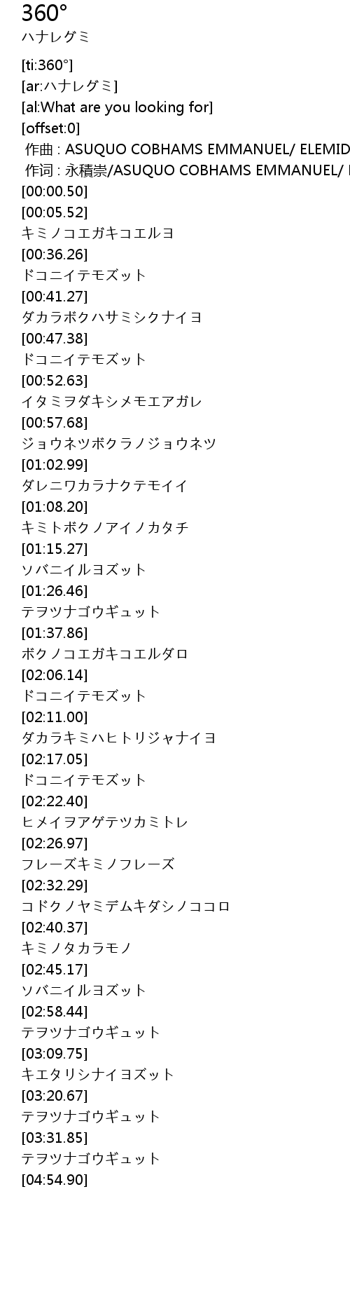 | [00:00.16] | 作词 : 永積崇/ASUQUO COBHAMS EMMANUEL/ ELEMIDE BUKOLA |