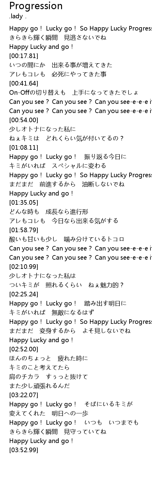 | [01:20.33] | Happy go! Lucky go! So Happy Lucky Progress! |
