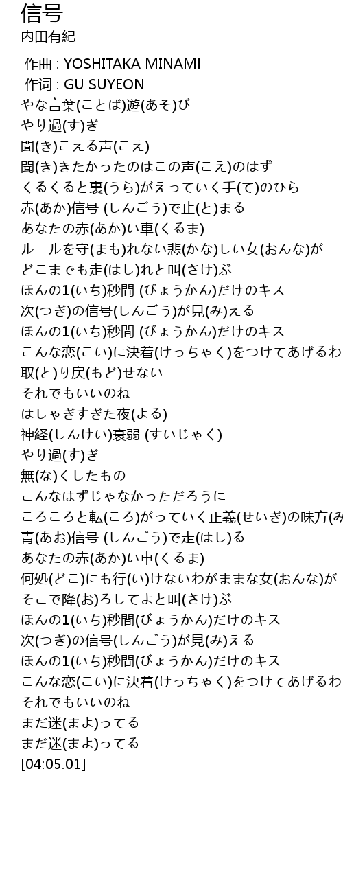 | [00:37.74] | 赤(あか)信号 (しんごう)で止(と)まる |
