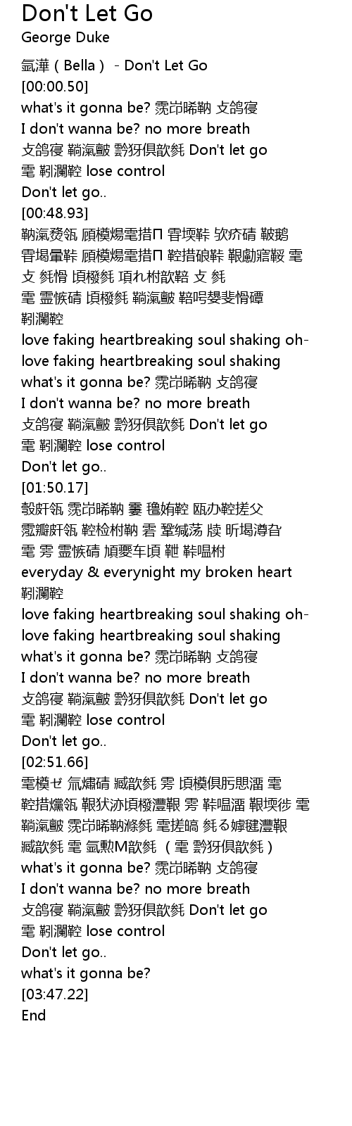 | [00:00.00] | yà hé Bella Don' t Let Go |