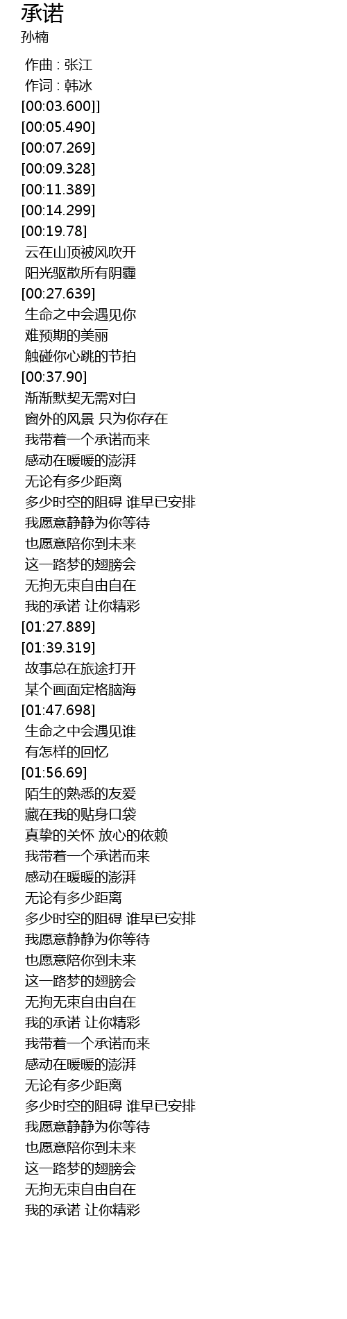 | [00:52.99] | wǒ dài zhe yí gè chéng nuò ér lái |
