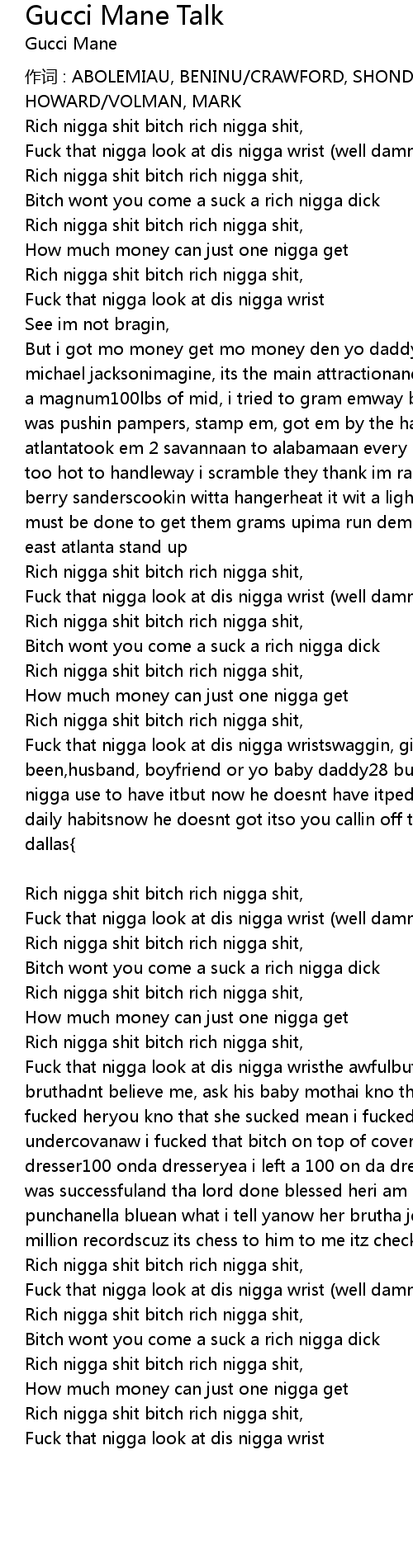 | Fuck that nigga look at dis nigga wristhe awfulbut still i got mo money den her bruthadnt believe me, ask his baby mothai kno that he love heryou kno that i fucked heryou kno that she sucked mean i fucked her wit a rubberfucked her undercovanaw i fucked that bitch on top of coversden i left a 100 on da dresser100 onda dresseryea i left a 100 on da dresserjust to show that girl i was successfuland tha lord done blessed heri am not regretfulnicknamed her punchanella bluean what i tell yanow her brutha jealoustell brotha sell a million recordscuz its chess to him to me itz checkers (gucci) | |