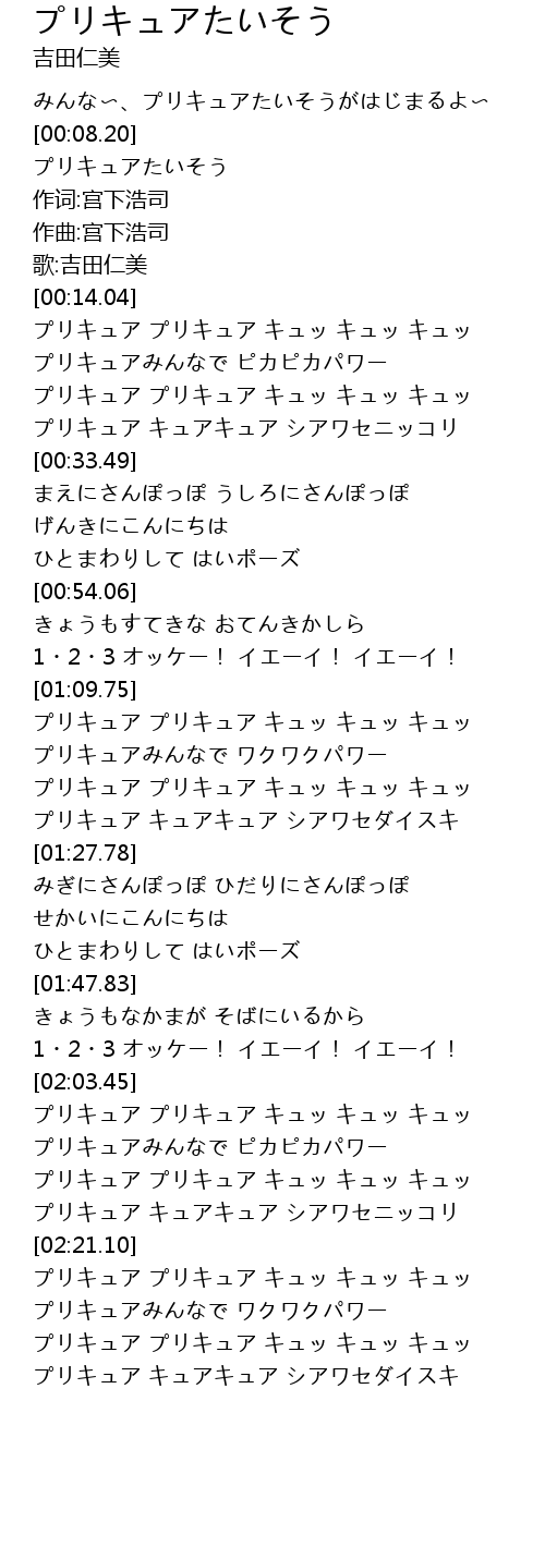 | [02:03.71] | プリキュア プリキュア キュッ キュッ キュッ |