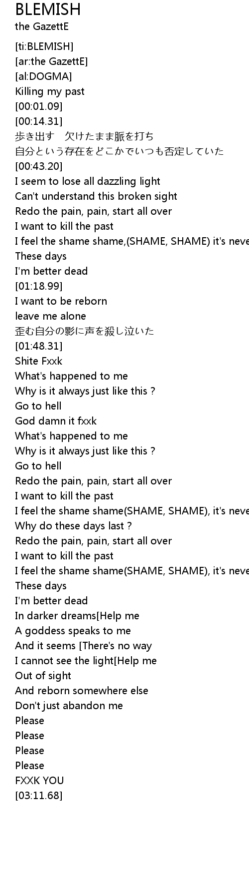 | [02:22.79] | I feel the shame shame SHAME, SHAME, it' s never over |