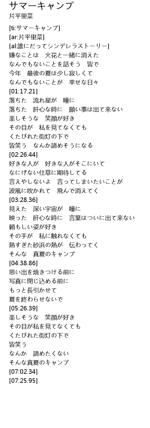 | [01:17.78] | 落ちた 流れ星が 瞳に |