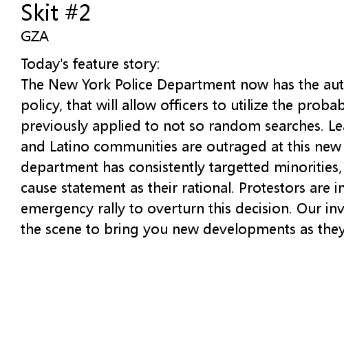 The New York Police Department now has the authority to enforce a shoot to kill policy, that will allow officers to utilize the probable cause statement previously applied to not so random searches. Leaders from the African American and Latino communities are outraged at this new policy, stating that the police department has consistently targetted minorities, using the ambiguous probable cause statement as their rational. Protestors are in the middle of organizing an emergency rally to overturn this decision. Our investigative reporters are on the scene to bring you new developments as they occur...