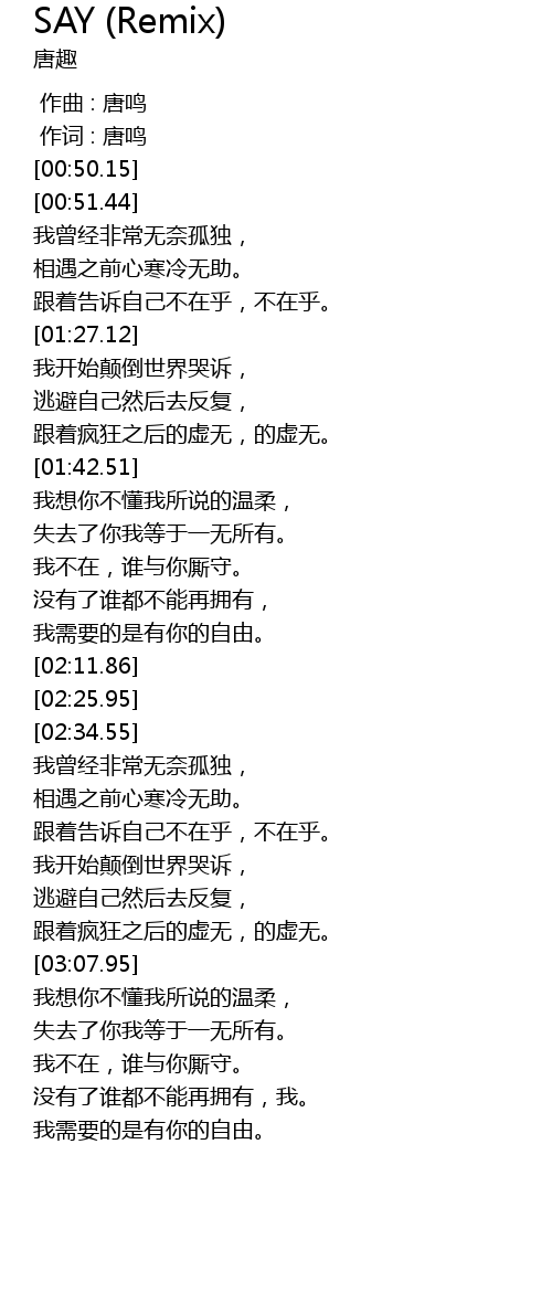 | [00:01.00] | 作词 : 唐鸣 |