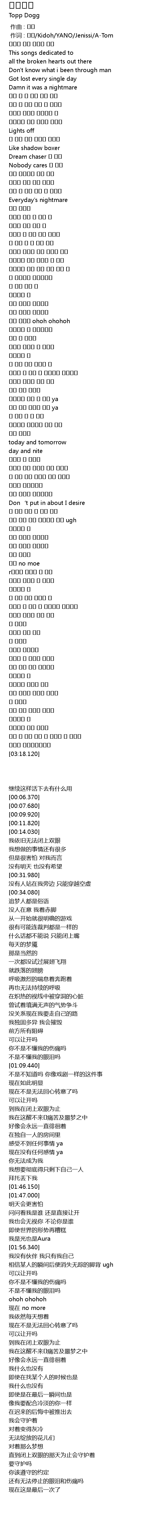 | [00:01.00] | 作词 : 쿤요/Kidoh/YANO/Jenissi/A-Tom |