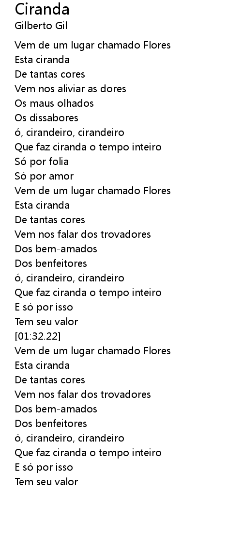 | [01:13.85] | o, cirandeiro, cirandeiro |