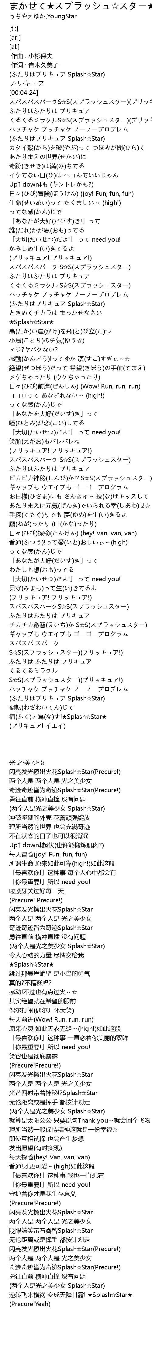 | [00:11.90] | 奇迹奇迹皆为奇迹Splash☆Star(Precure!) |