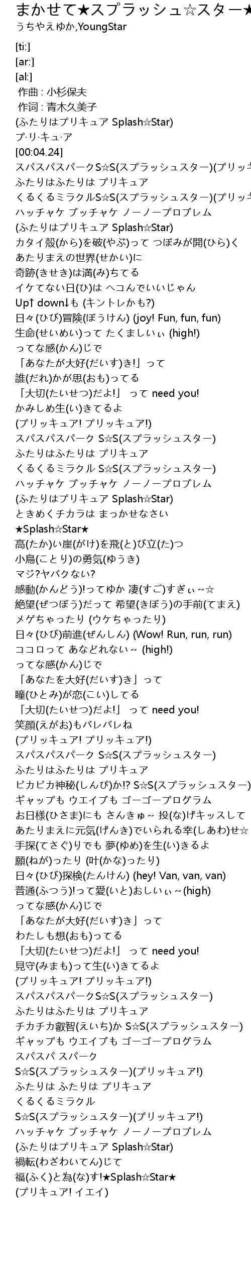 | [00:06.71] | スパスパスパークS☆S(スプラッシュスター)(プリッキュア!) |