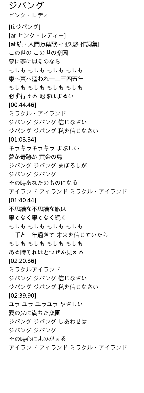 | [02:51.79] | ジパング ジパング しあわせは |