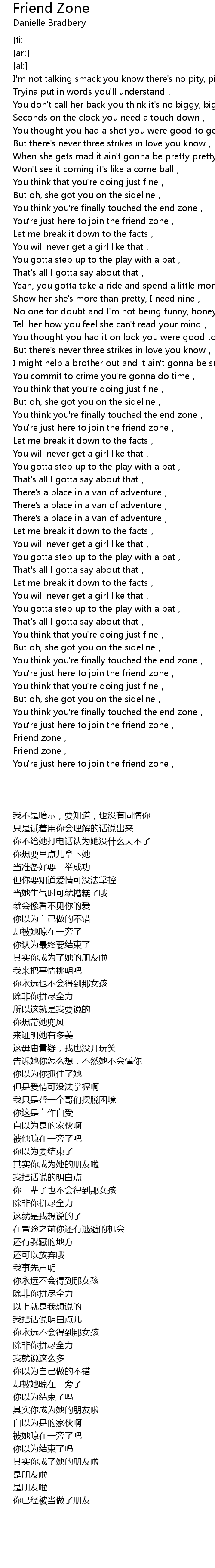 | [00:46.57] | You' re just here to join the friend zone, |
