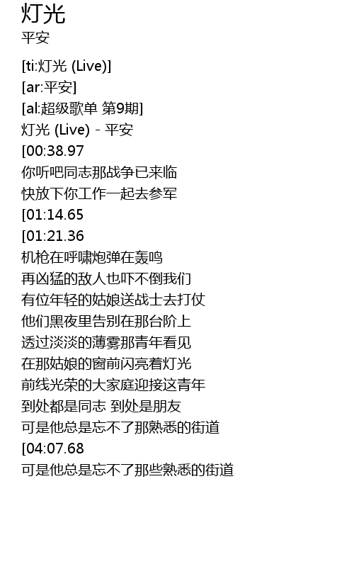| [00:00.01] | 灯光 (Live) - 平安 |