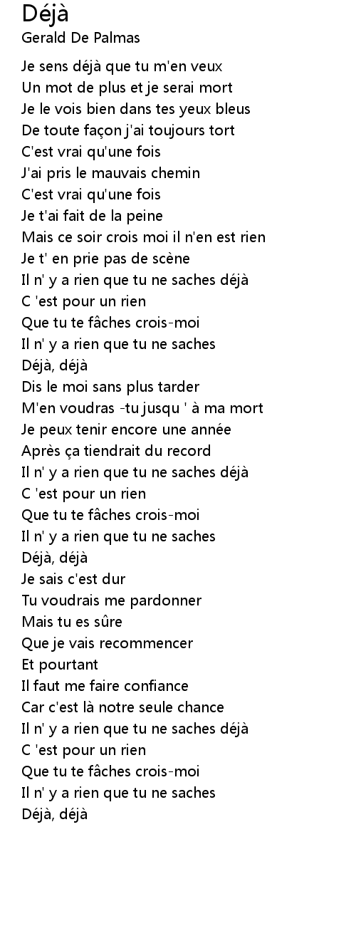| Je sens dé jà que tu m' en veux | |