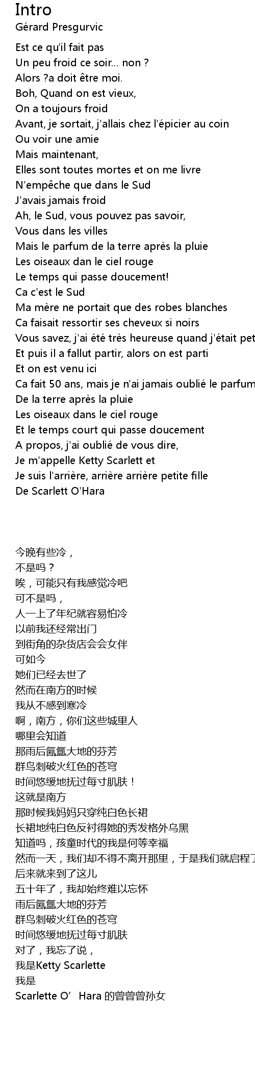 | [01:14.710] | Ca fait 50 ans, mais je n' ai jamais oublie le parfum |