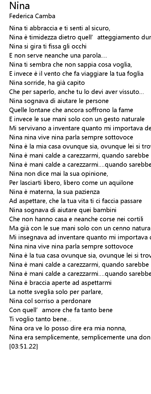 | [02:22.73] | Nina è mani calde a carezzarmi. quando sarebbe lei da accarezzare |