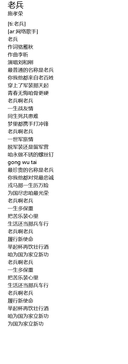 | [02:08.418] | 最珍贵的名称是老兵 |