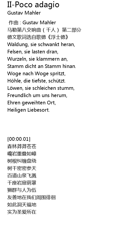 | [00:00.01] | 马勒第八交响曲(千人) 第二部分 德文歌词选自歌德《浮士德》 |