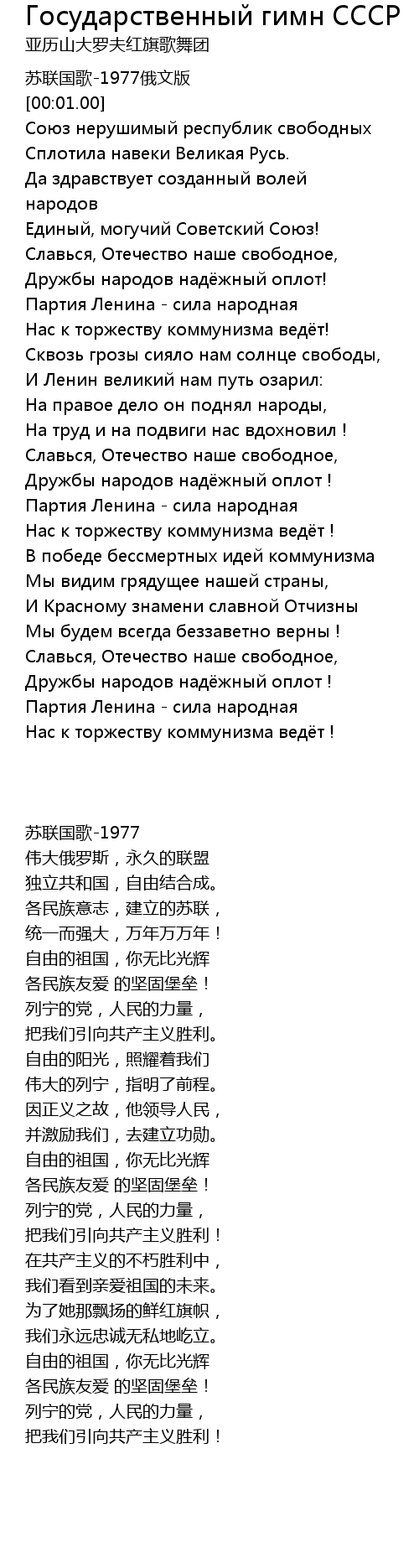 | [00:00.00] | 苏联国歌-1977俄文版 |