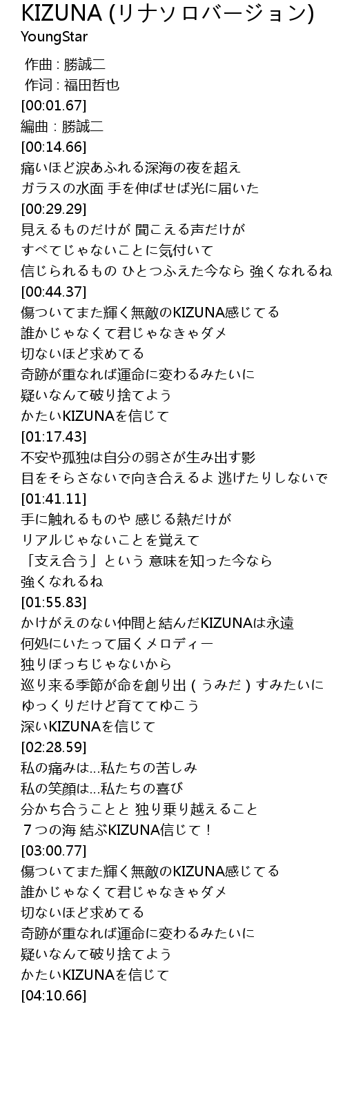 | [01:56.71] | かけがえのない仲間と結んだKIZUNAは永遠 |