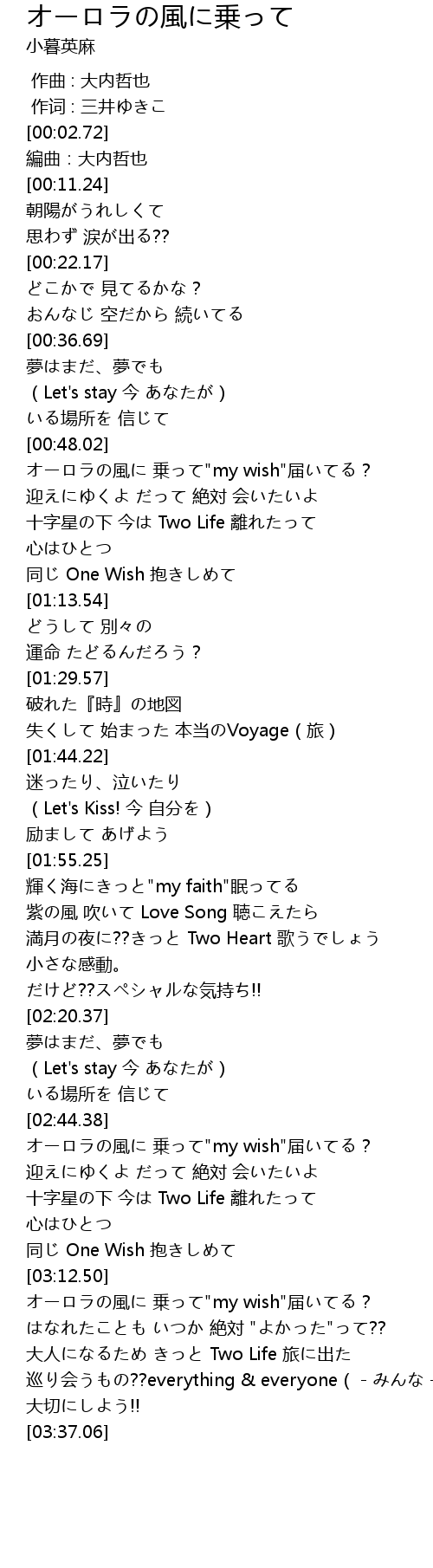 | [03:13.59] | オーロラの風に 乗って"my wish"届いてる? |