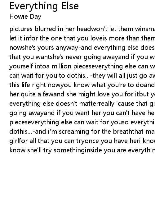 | pictures blurred in her headwon't let them winsmash a fist or tworight back and let it infor the one that you loveis more than them fuck themthink about her nowshe's yours anyway-and everything else doesn't matterreally 'cause that girl that you wantshe's never going awayand if you want her you can't have herbreak yourself intoa million pieceseverything else can wait for youso everything else can wait for you to dothis...-they will all just go awayall of the demonsenjoy this life right nowyou know what you're to doand lettersyes they matter write her quite a fewand she might love you for itbut you can't count on itand everything else doesn't matterreally 'cause that girl that you wantshe's never going awayand if you want her you can't have herbreak yourself intoa million pieceseverything else can wait for youso everything else can wait for you to dothis...-and i'm screaming for the breaththat makes you aliveyou want that girlfor all that you can tryonce you have heri know she'll be so great for youi know she'll try somethinginside you are everything else(chorus) |
