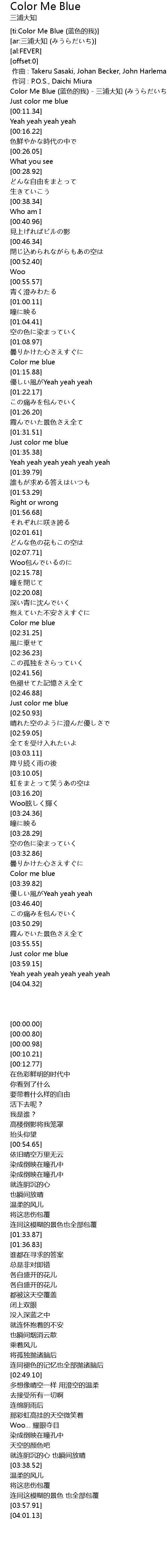 | [00:00.00] | Color Me Blue (蓝色的我) - 三浦大知 (みうらだいち) |