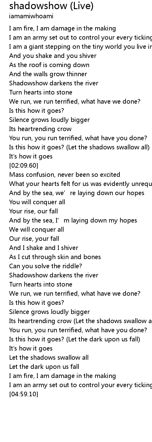 | [02:01.12] | Is this how it goes? Let the shadows swallow all |