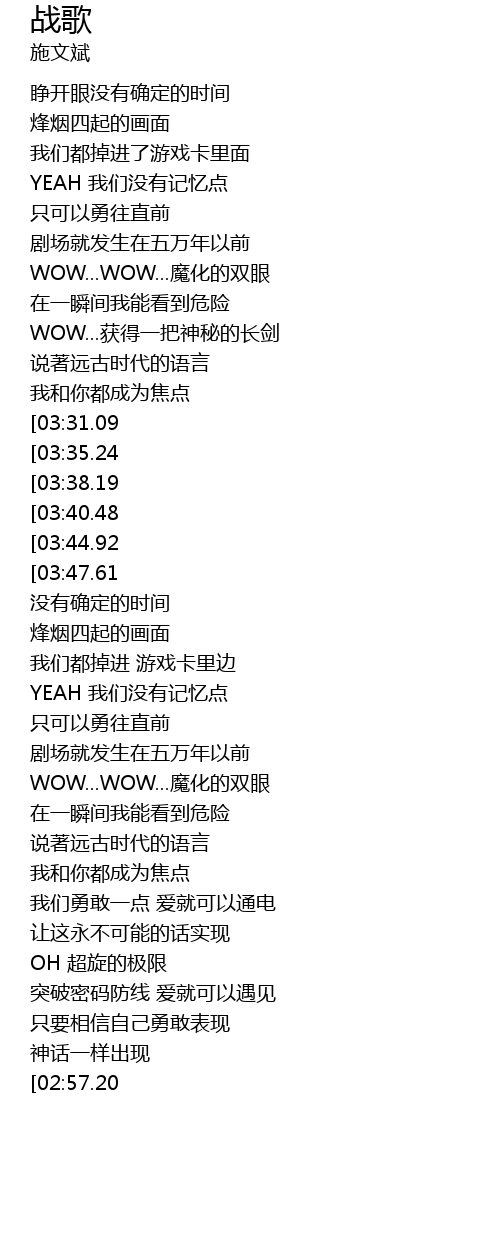 | [04:03.97][03:44.92][03:25.60][01:35.30] | 只要相信自己勇敢表现 |
