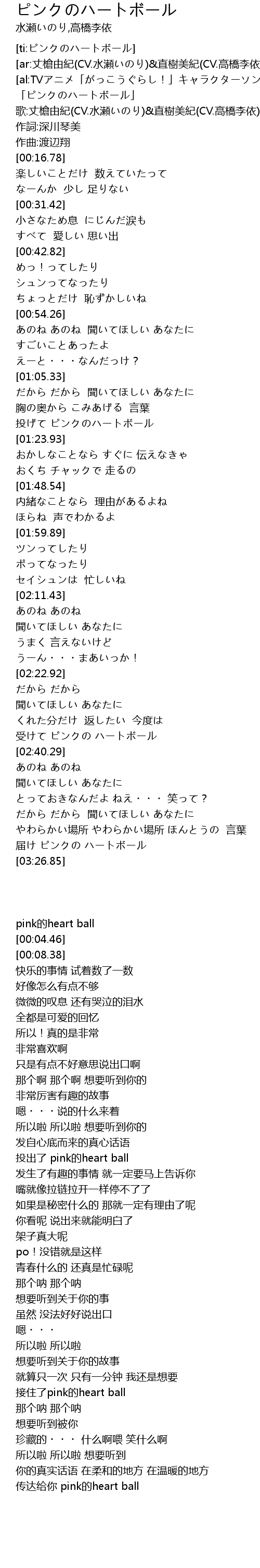 | [02:34.15] | 受けて ピンクの ハートボール |