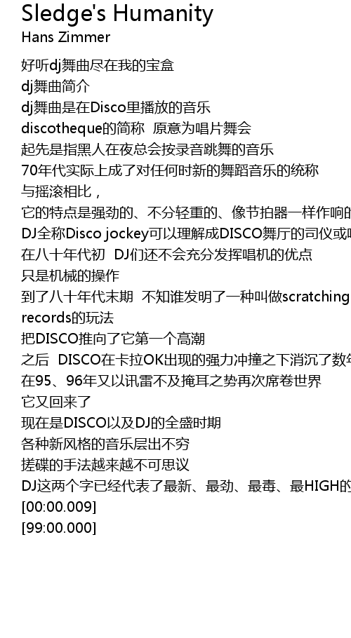 | [01:32.39] | dj舞曲是在Disco里播放的音乐 |