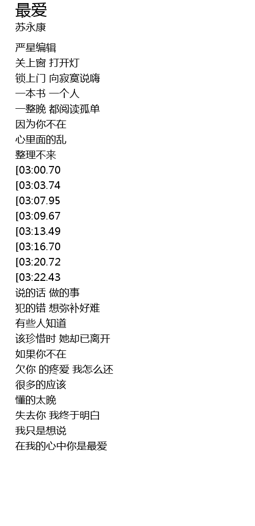 | [03:35.39][03:09.67][02:44.22][01:37.14][00:45.82] | 我还是你的最爱 |