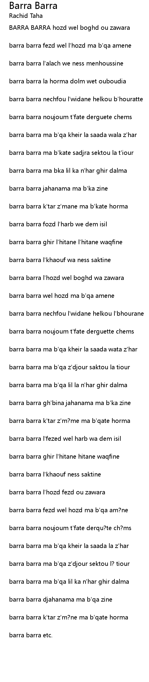barra barra fezd wel l'hozd ma b'qa amene |