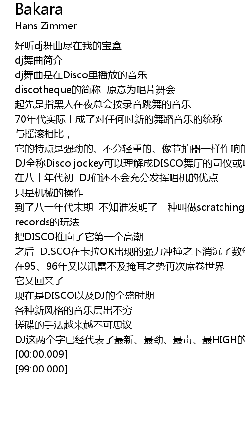 | [01:32.39] | dj舞曲是在Disco里播放的音乐 |